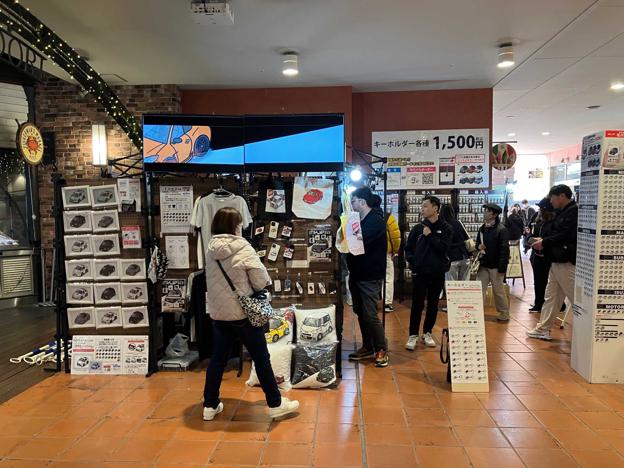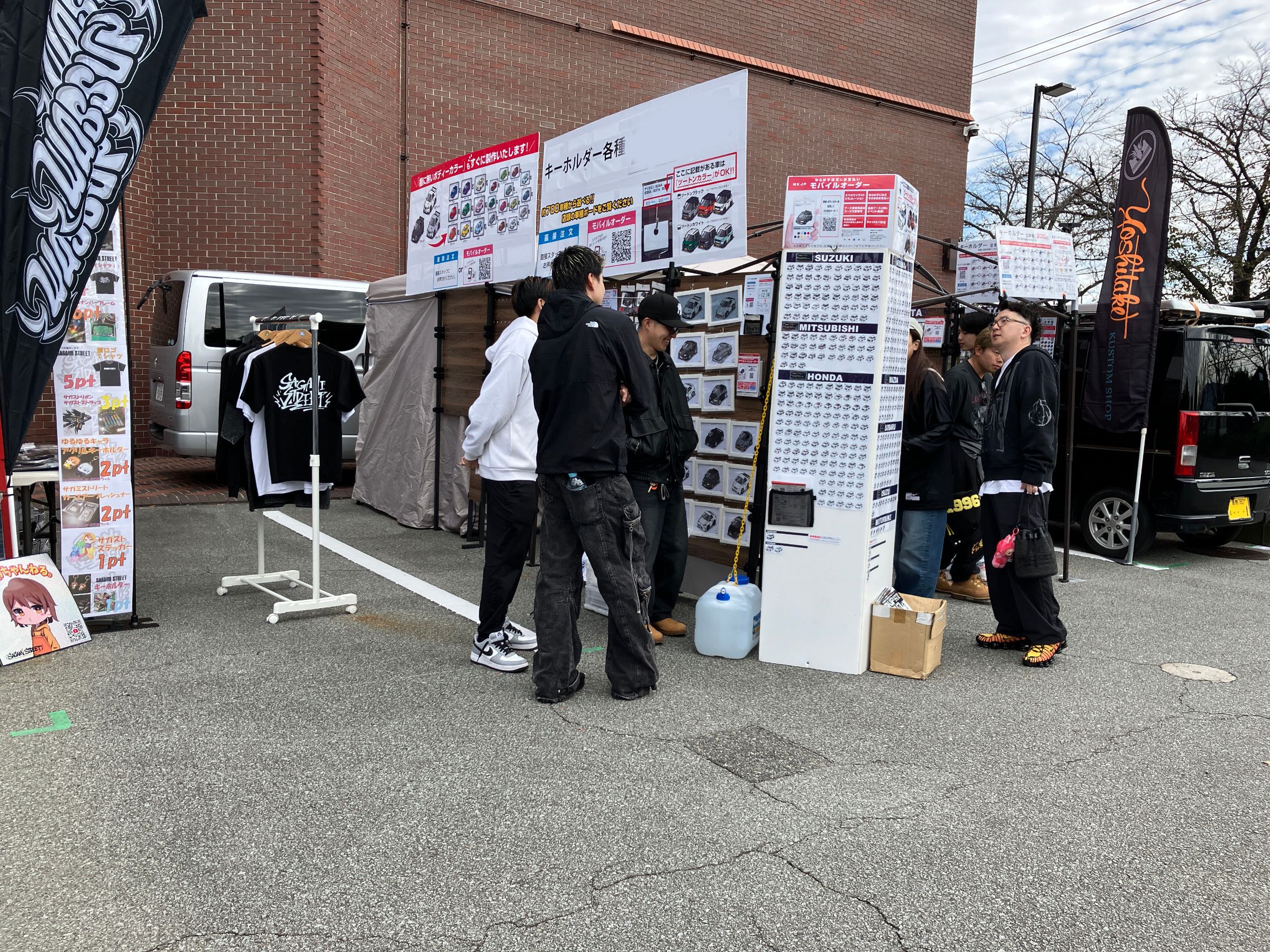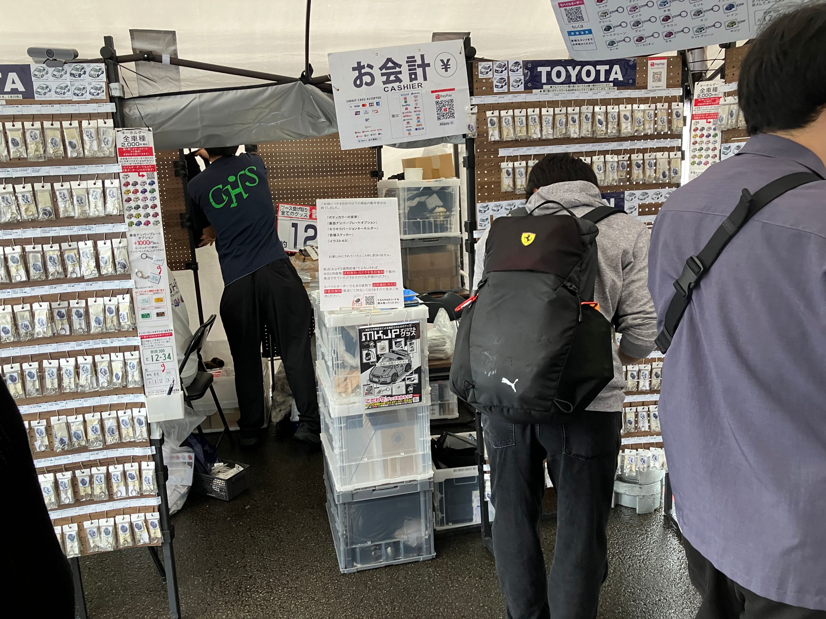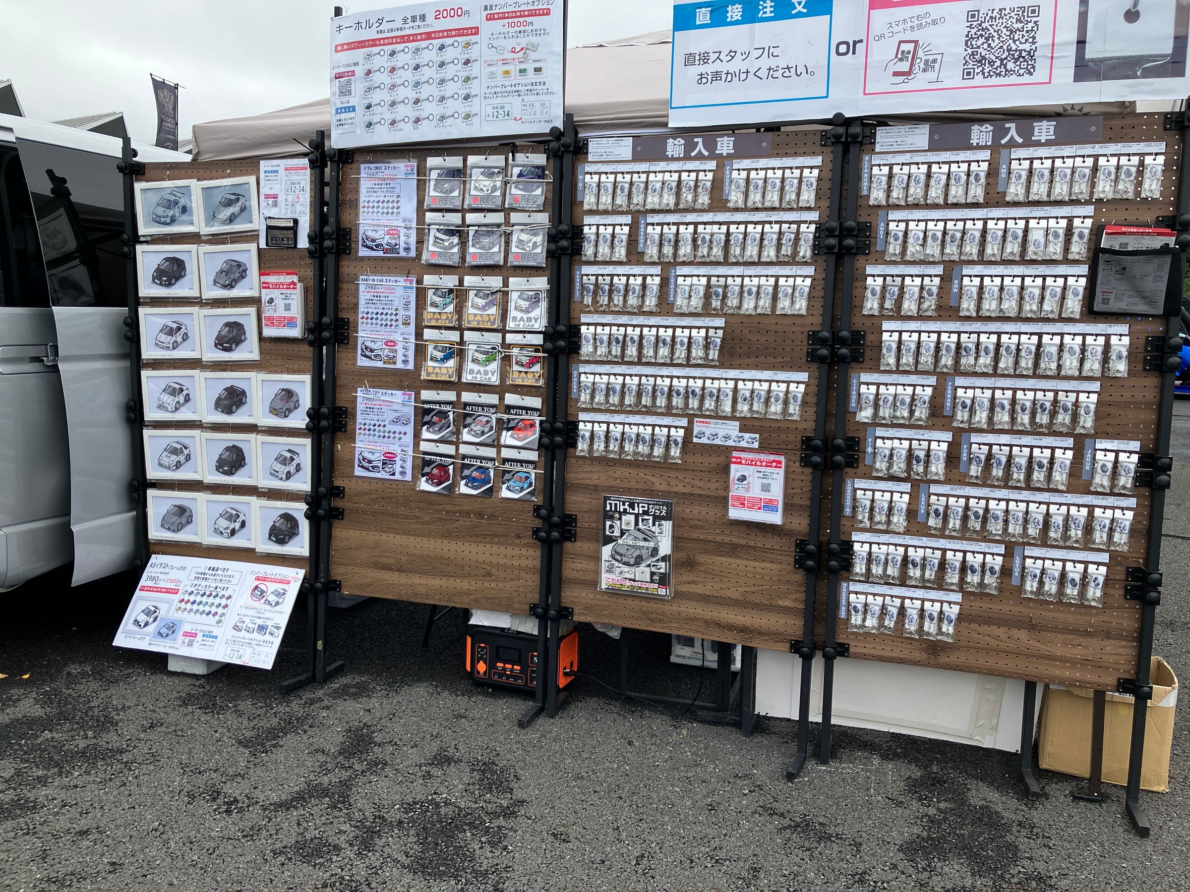 MKJPブースでは、700車種におよぶ車イラストで、キーホルダーやステッカー・エンブレムなどの雑貨やTシャツ・パーカーなどのアパレル、またスマホケースやエコバッグなどのグッズを販売いたしました。はじめてのイベント出店で初日には予想を上回るオーダーでパンクしてしまい、即日お渡しできる商品のオーダーに限り停止させてきただきました。