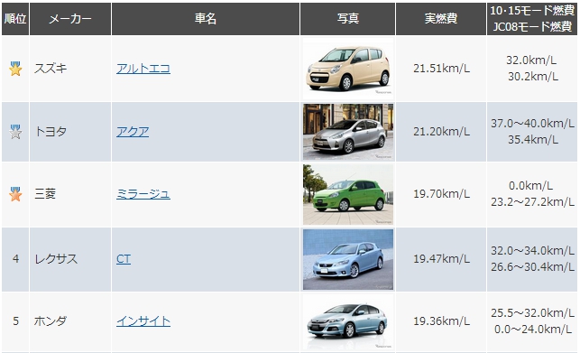 の順になり、どの自動車も実燃費で20km/L近くの燃費を実現しています。